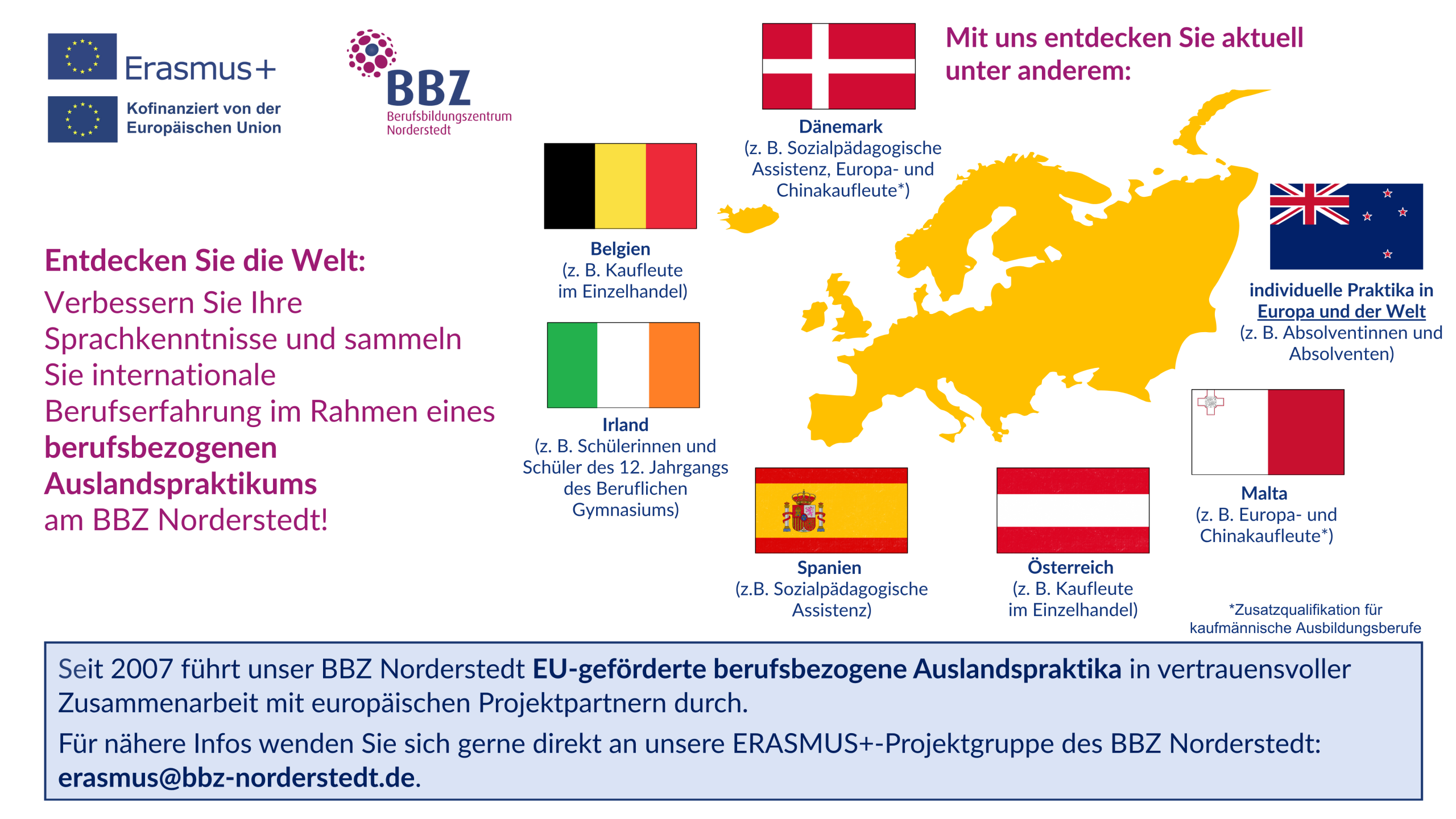 Erasmus+ ist das Bildungs- und Förderprogramm der Europäischen Union, das finanzielle Unterstützung für Lern- und Arbeitsaufenthalte im Ausland bereitstellt. Ziel des Programms ist es, berufliche Bildung zu stärken, internationale Zusammenarbeit zu fördern und jungen Menschen den Zugang zu modernen europäischen Arbeits- und Lernwelten zu ermöglichen.